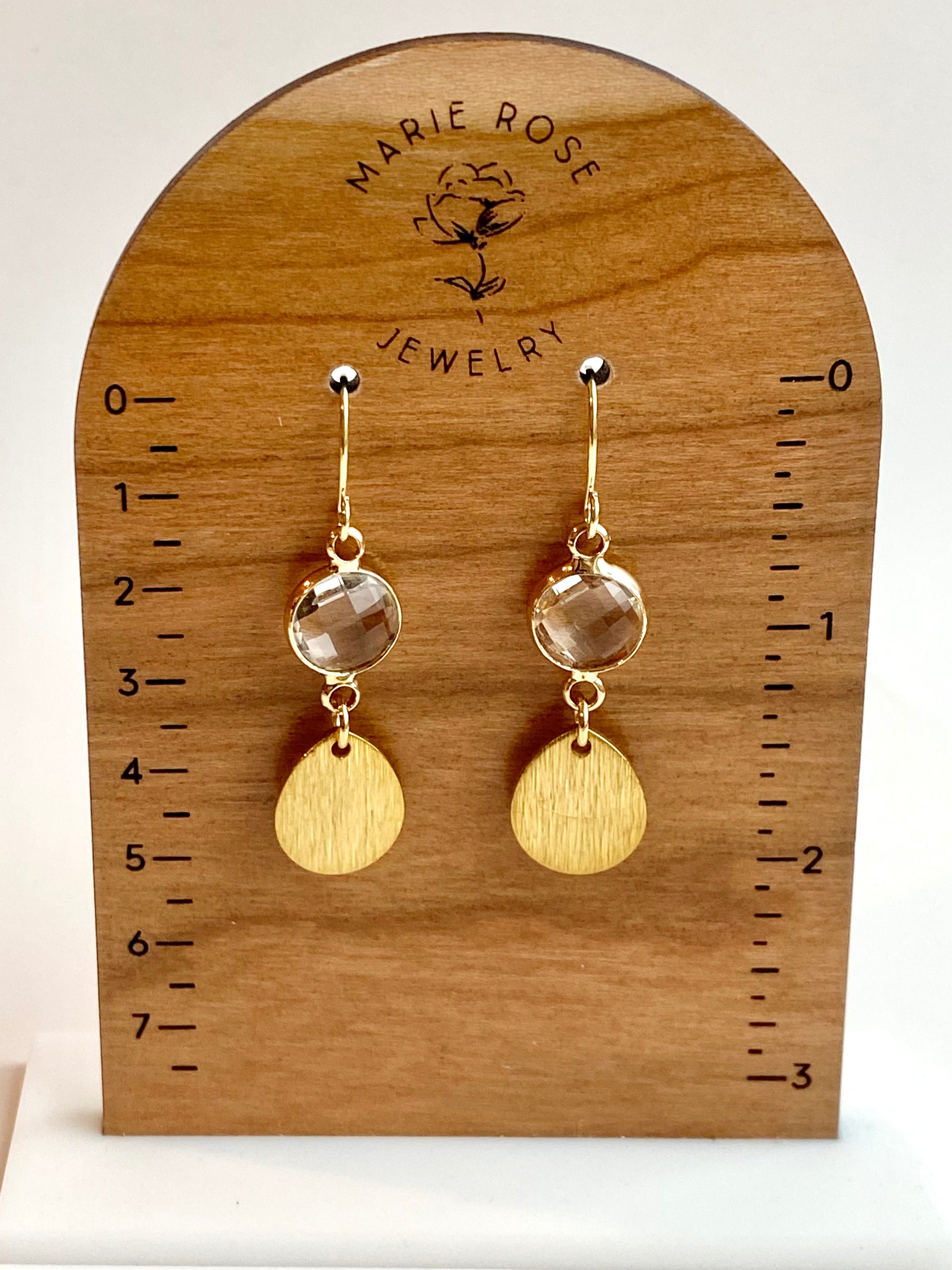 Clear faceted crystal and brushed brass teardrop.